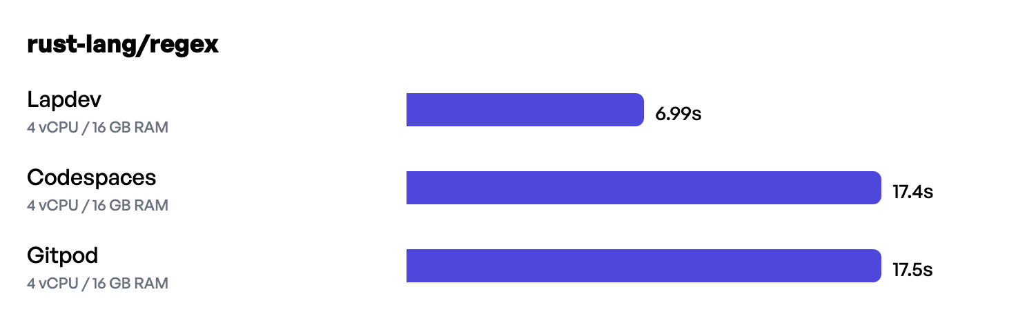 Lapdev outperforms cloud development environments like GitHub Codespaces and Gitpod in development tasks such as code compilation by leveraging high-performance single-core CPU.